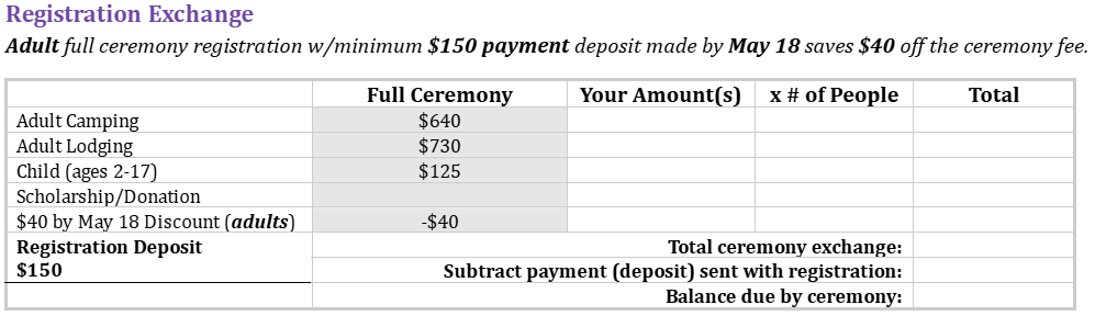 Each adult full ceremony registration with $150 received by May 18 saves $40 off the ceremony fee.